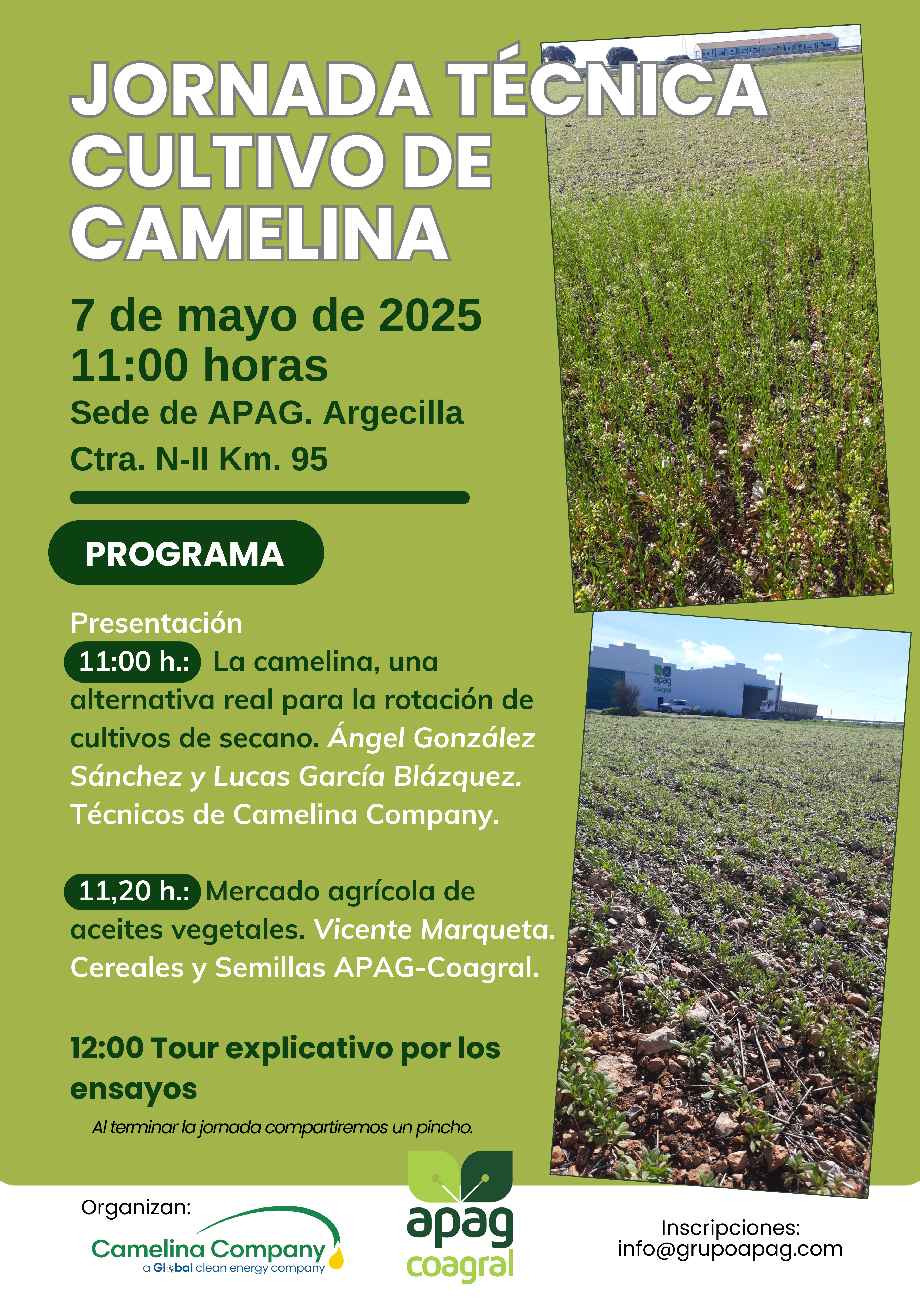 APAG ha convocado para el Miércoles día 7 de Mayo una jornada técnica sobre el cultivo de Camelina, que se ha organizado junto a Camelina Company. En ella se mostrará el estado de los ensayos que este año se han implantado en Argecilla.