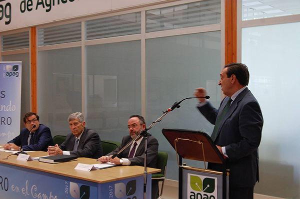 El presidente nacional de Asaja nacional, Pedro Barato, felicitó a los socios galardonados y a todos los demás, porque ”entre todos habéis hecho grande APAG”. Barato destacó algunos hechos significativos en la trayectoria de APAG, como la constitución de la SAT Coagral en 1985, la compra de las instalaciones de Merco en 1988, con Fernando López Carrasco, el logro del aumento de rendimientos teóricos en los cultivos, o las transmisiones en ovino. Y el más importante: haber logrado un modelo de éxito en la unión entre una OPA y el movimiento cooperativo, ”porque el modelo a seguir es ése” dijo.