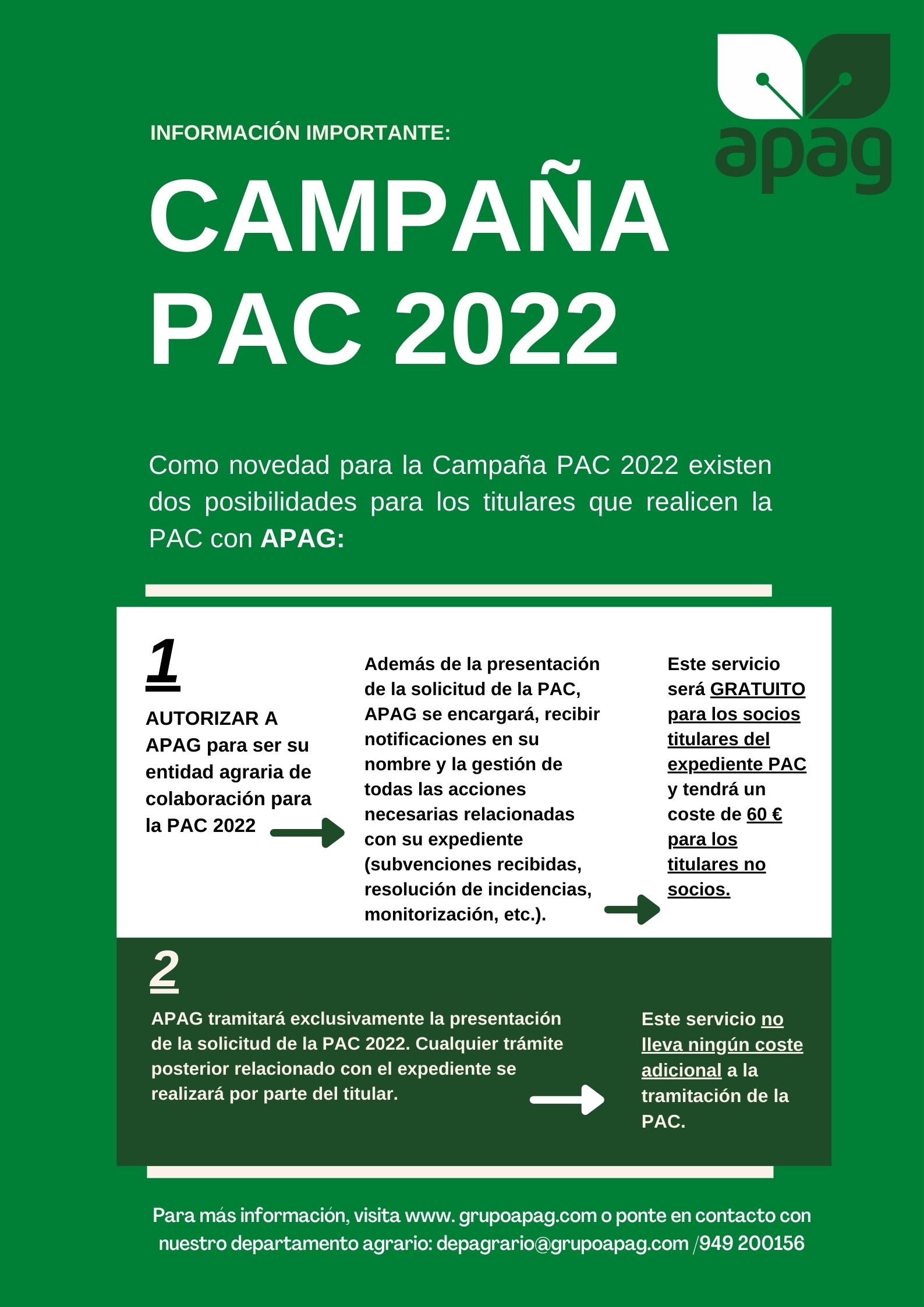 2. Además de la realización del expediente, escoger a APAG como Entidad Agraria Colaboradora. Este servicio será gratuito para socios titulares PAC y llevará un coste de 60 euros para no socios.