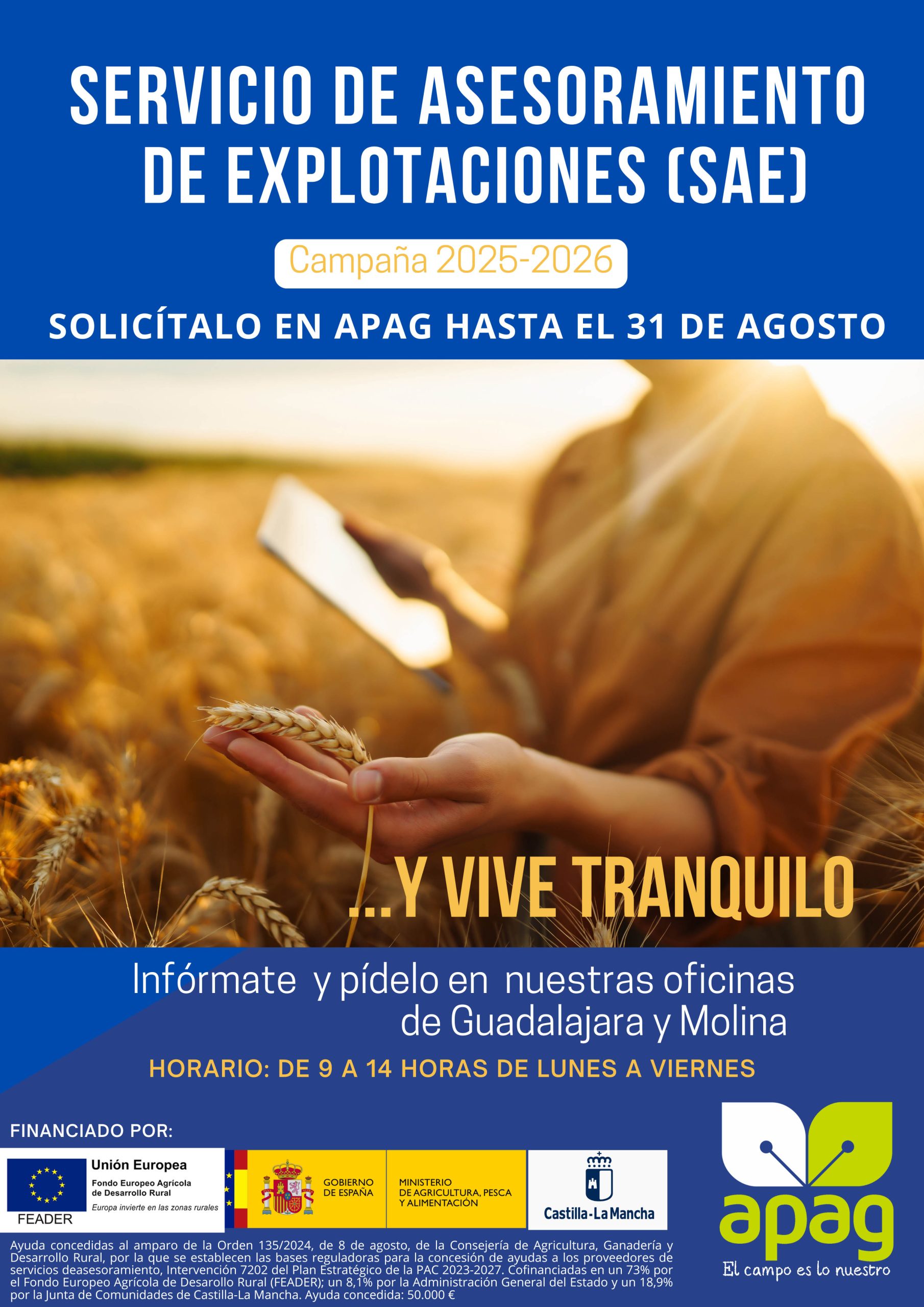 Para la campaña 2025/2026 APAG volverá a prestar a sus socios el Servicio de Asesoramiento de Explotaciones (SAE). Por cuarta vez, APAG ha solicitado la ayuda para llevar a cabo este servicio en las explotaciones agrícolas y ganaderas de la provincia de Guadalajara (al amparo de la Orden 135/2024 de 8 de Agosto de la Consejería de Agricultura, Ganadería y Desarrollo Rural de Castilla-La Mancha, dentro del Plan Estratégico de la PAC 2023/2027. La Viceconsejería de PAC y Política Agroambiental ha resuelto conceder la citada ayuda, que será de 50.000€ y está cofinanciada por la Unión Europea- a través del FEADER- el Ministerio de Agricultura, y la Junta de Comunidades de Castilla-La Mancha.