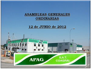 La Asociación Provincial de Agricultores y Ganaderos APAG-Asaja Guadalajara y su sociedad comercializadora SAT Coagral celebrarán hoy, día 12 de Junio sus Asambleas Genereales correspondientes al Ejercicio de 2011. Las Asambleas tendrán lugar en la sede central de la organización, en Guadalajara y a ellas están convocados todos los socios.