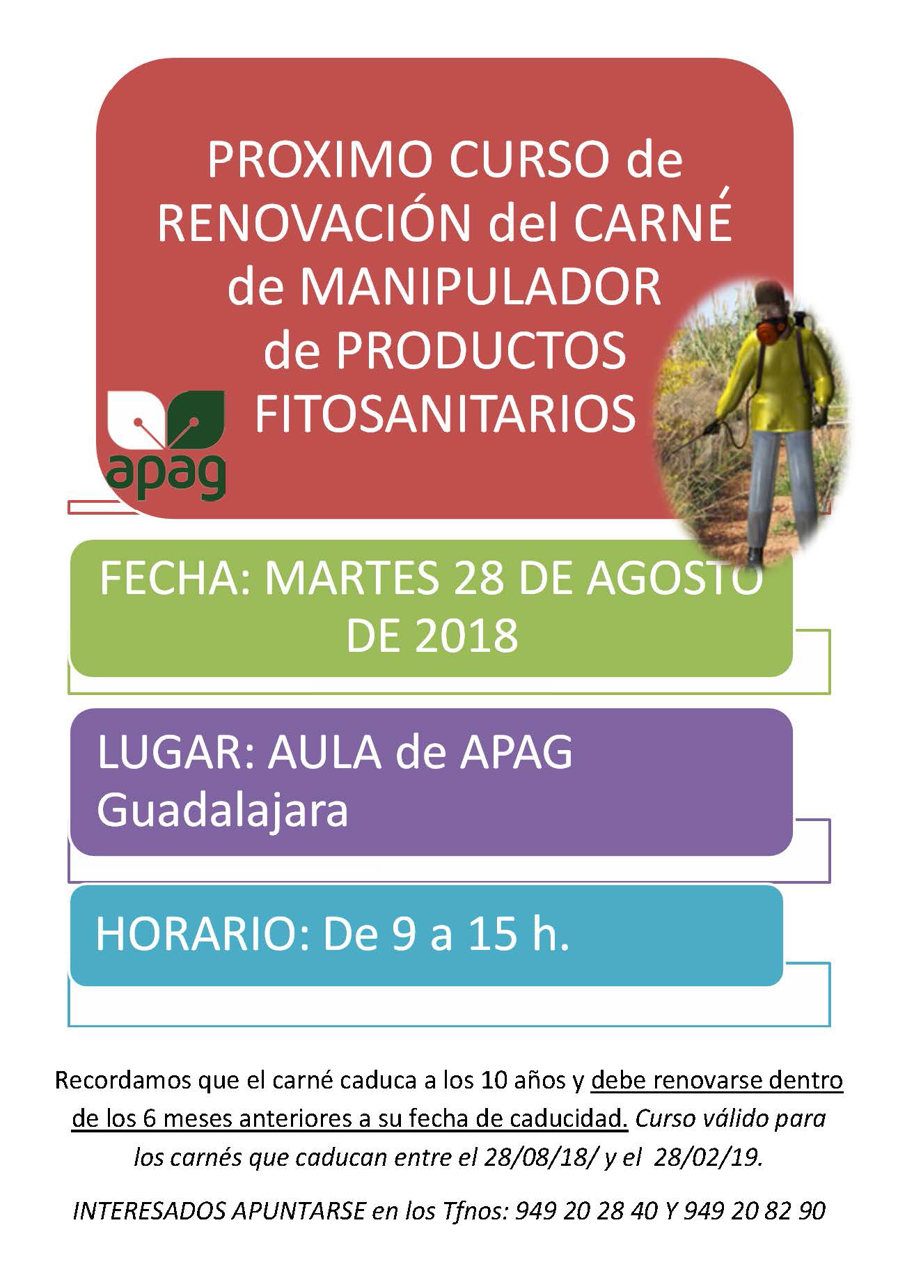 El próximo martess 28 se impartirá en APAG Guadalajara un Curso de Renovación del carné de Fitosanitarios.