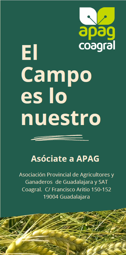 En cumplimiento de la Ley 34/2002, de 11 de Julio, de Servicios de la Sociedad de la Información y de Comercio Electrónico, le informamos que SAT Nº 6061 COMERCIAL AGROPECUARIA ALCARREÑA (COAGRAL) con F19019686 inscrita en el registro de SS. AA. TT de CLM folio 1, hoja 6061, folio 61 del tomo 31 y ASOCIACION PROVINCIAL DE AGRICULTORES Y GANADEROS (APAG) con G19006303, ambas con domicilio en FRANCISCO ARITIO, 150-152, 19004 Guadalajara, España son titulares de este sitio Web. En adelante figurarán como APAG y COAGRAL.