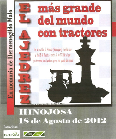 En la mañana de hoy , se ha mantenido una rueda de prensa de APAG, para informar sobre la convocatoria de “EL AJEDREZ MAS GRANDE DEL MUNDO CON TRACTORES”, cuya idea y organización es de Calos Malo, joven agricultor de Hinojosa, estando acompañado del Secretario General de APAG, la cual apoya este proyecto y copatrocina, se celebrará el 18 de Agosto del 2012 en HINOJOSA.