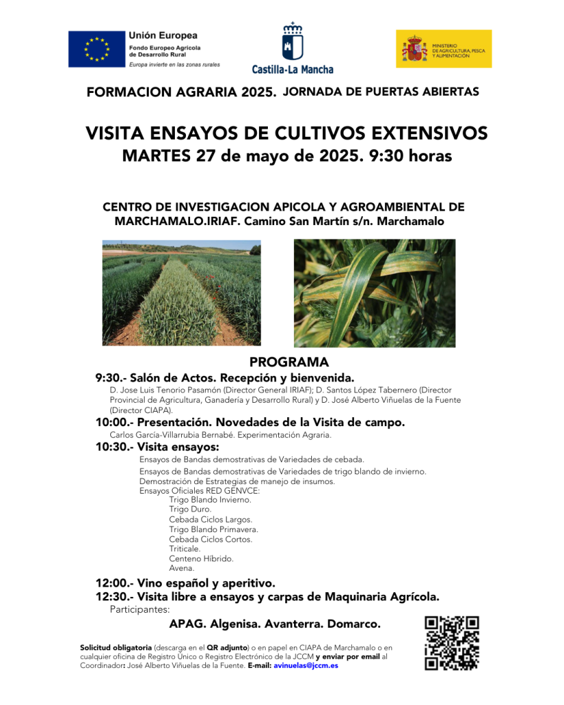 APAG estará presente en esta jornada técnica que será el próximo 27 de mayo a las 9:30 horas en el IRAF (Camino San Martin s/n. Marchamalo). Consistirá en visitar los ensayos de cultivos extensivos de variedades de cebada, de trigo blando de invierno, trigo duro, cebada ciclos largos o tricale entre otros. Además, este año como novedad habrá carpas de exposición de maquinaria y servicios agrícolas.