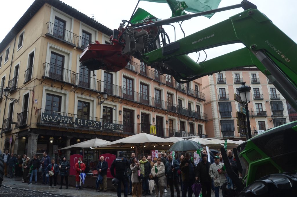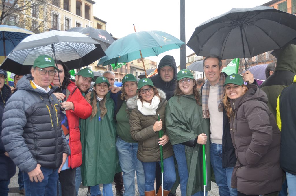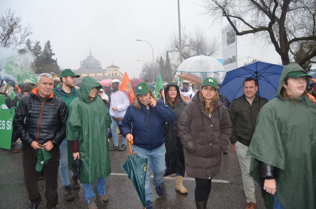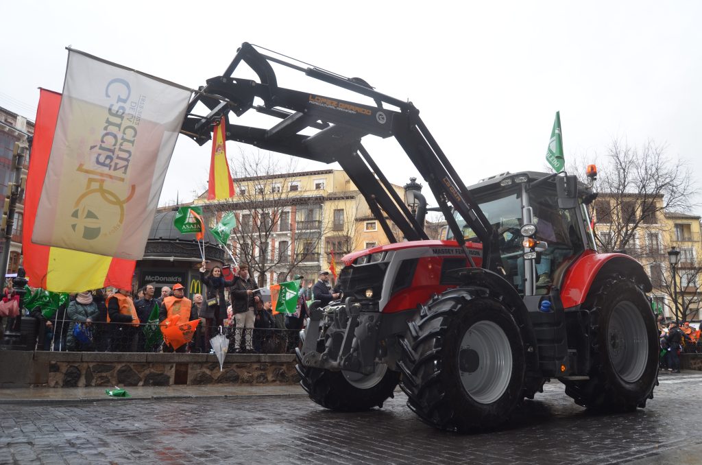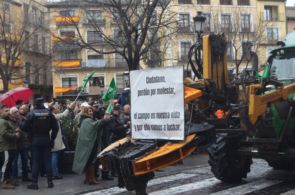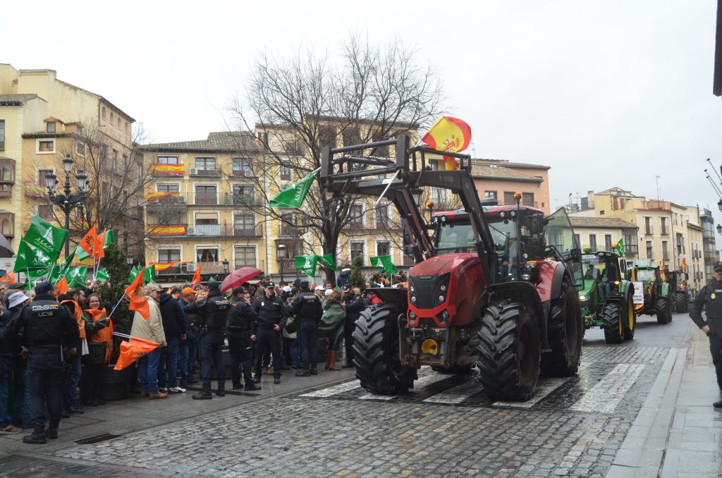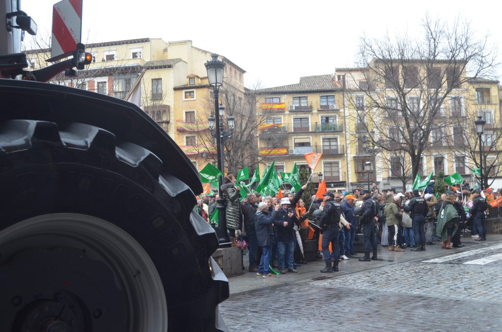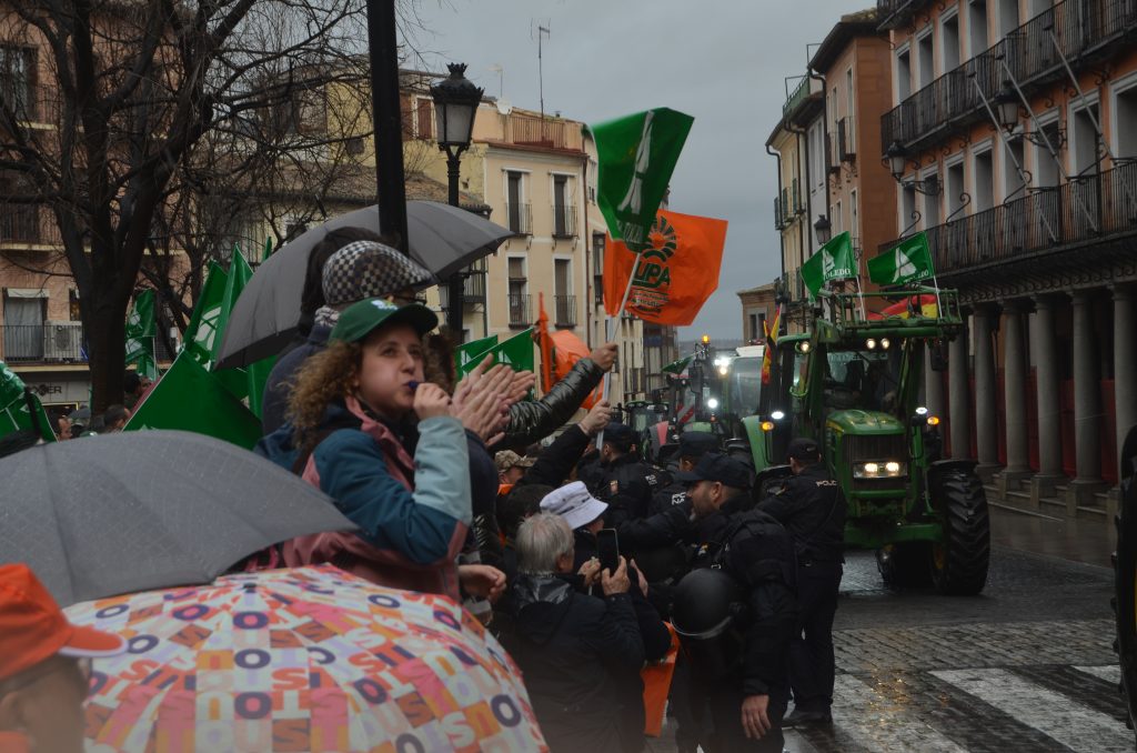 La lluvia, que fue intensa en algunos momentos no frenó a los manifestantes y tractore que consumaron el recorrido desde la Plaza de Toros hasta la Plaza de Zocodover. Una marcha en la que se escucharon pitos y cencerros y el sonido del claxón de los tractores que llegaron a Zocodover a partir de las 12,30 h entre aplausos de los manifestantes