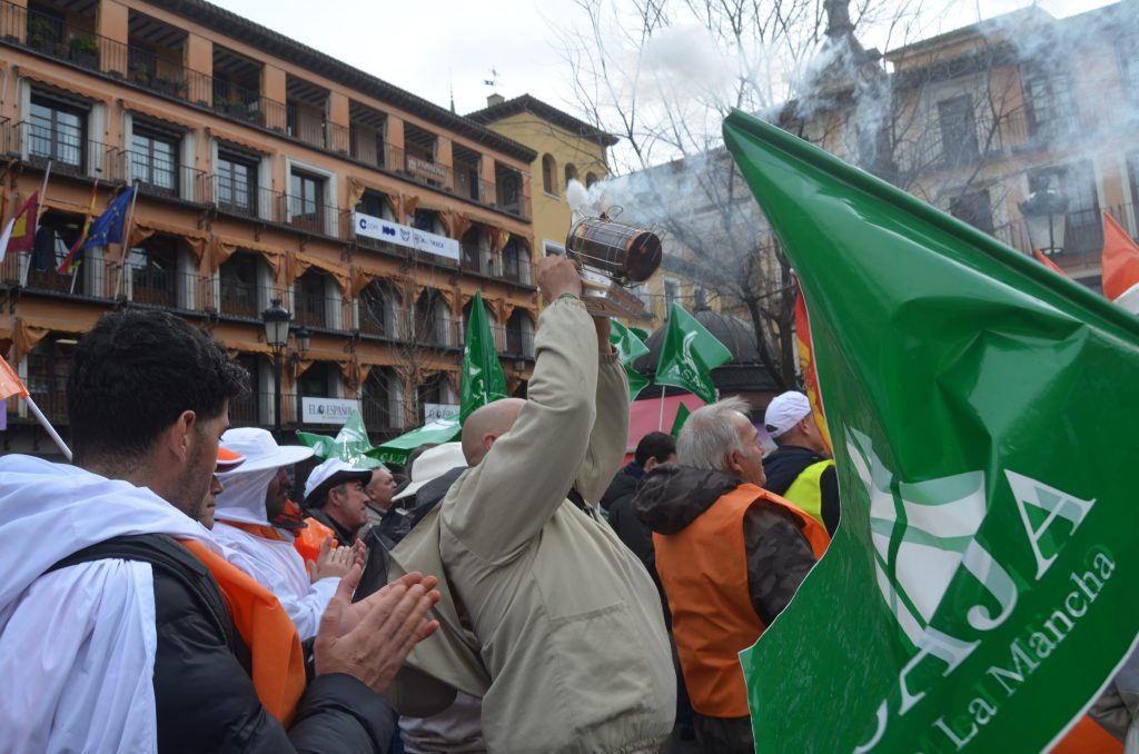 En la céntrica plaza toledana el presidente de Asaja Castilla-La Mancha, José María Fresneda, se dirigió a los agricultores y ganaderos advirtiendo que «el campo no va soportar más. No va tolerar más mentiras, ni con Mercosur, ni con la PAC, ni con los conejos».