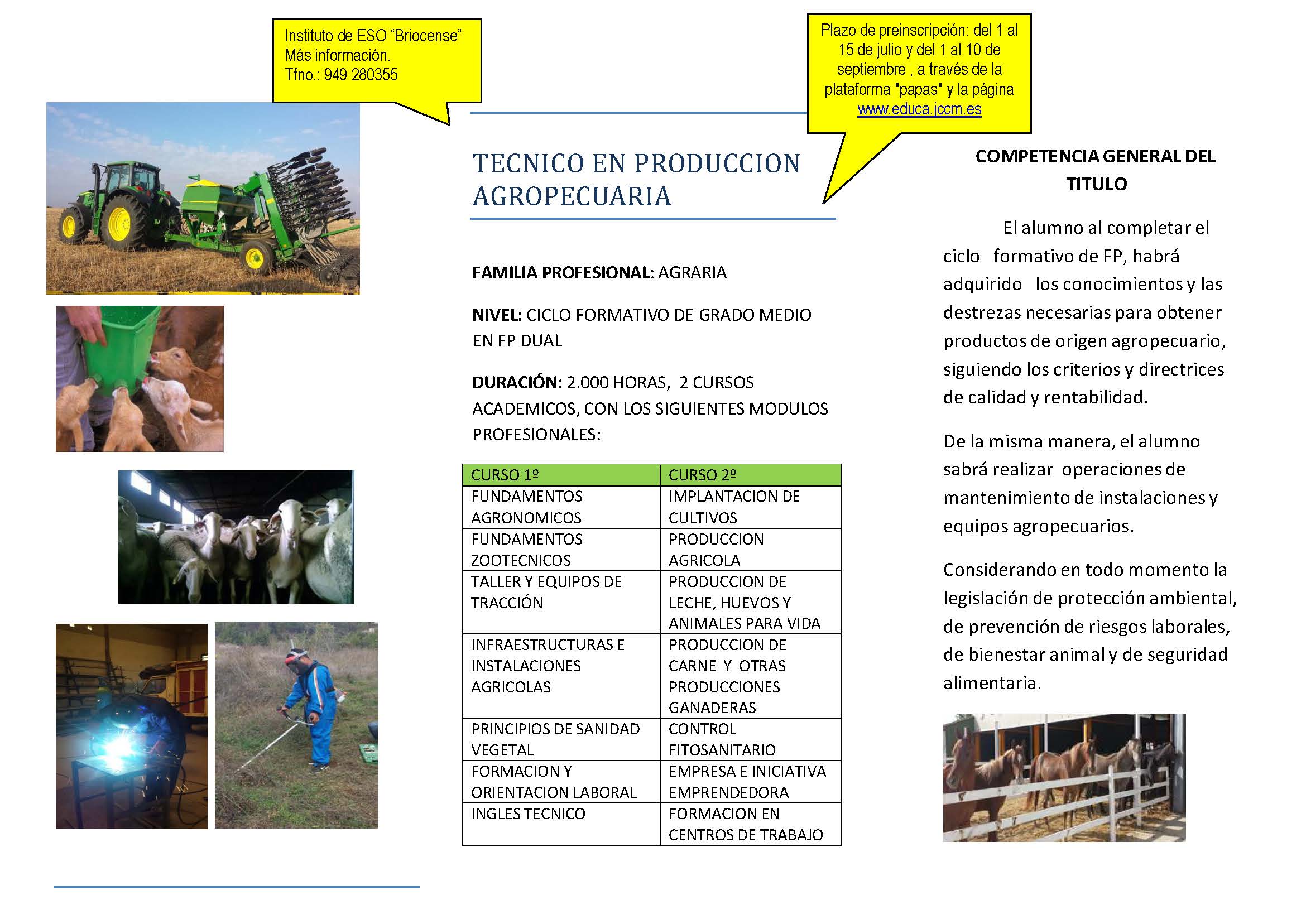 El próximo miércoles, día 15 de Julio, finaliza el primer plazo de preinscripción en el Ciclo Formativo de Grado Medio (FP Dual) de «Técnico en Producción Agropecuaria». Habrá un segundo plazo de preinscripción del 1 al 10 de Septiembre y después, el plazo de matriculación será del 25 al 30 de Septiembre para alumnos nuevos y del 10-11 de Septiembre para los alumnos del segundo curso.