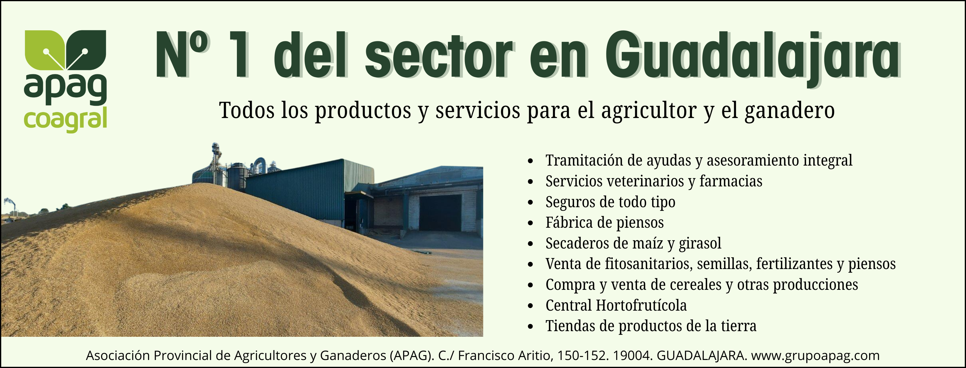 En cumplimiento de la Ley 34/2002, de 11 de Julio, de Servicios de la Sociedad de la Información y de Comercio Electrónico, le informamos de que ASOCIACIÓN PROVINCIAL DE AGRICULTORES Y GANADEROS DE GUADALAJARA (APAG) Y S.A.T Nº 6061 COMERCIAL AGROPECUARIA ALCARREÑA (COAGRAL) con CIF G19006303 y S.A.T. Nº 6061 COMERCIAL AGROPECUARIA ALCARREÑA (COAGAL) con CIF F19019686 y domicilio en C/ FRANCISCO ARITIO, 150-152 – 19004 – GUADALAJARA, son titulares de este sitio Web.
