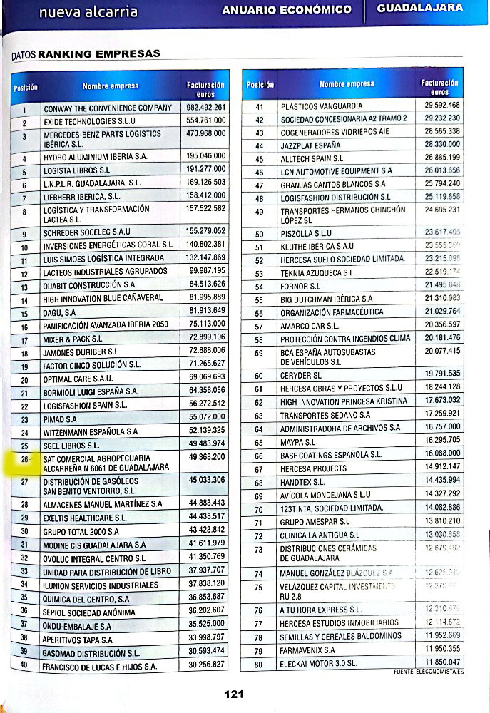 Nuestra SAT Comercial Agropecuaria Alcarreña, ocupa el número 26 en el ranking de empresas de la provincia de Guadalajara, por volumen de facturación. Así lo recoge el recientemente publicado Anuario Económico Guadalajara 2024, editado por Nueva Alcarria. Este dato nos sitúa como la empresa número uno en el sector de comercialización de cereales y piensos a muchos puestos de distancia de cualquier competidor.