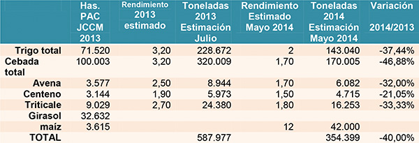 En este cuadro se puede ver la estimación de cosecha de cereales, por cultivos en comparación con la campaña de 2013.