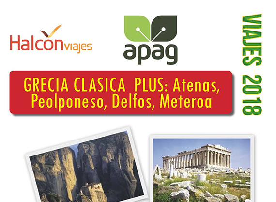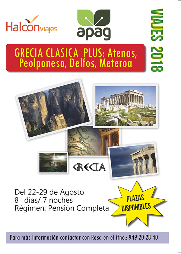 APAG está organizando sus viajes de vacaciones para socios y familiares. Este año hemos lanzado dos destinos muy apetecibles: Un viaje fuera de España: GRECIA CLÁSICO: Atenas, Peloponeso, Delfos y Meteora, que será del 22 al 29 de Agosto y como es habitual un segundo destino dentro de nuestro país que este año será País Vasco y Aquitania, que será del 21 al 27 de Septiembre. (este viaje ya está completo) En ambos casos en régimen de pensión completa. Para toda la información sobre viajes es necesario contactar por tfno. con Rosa: 949 20 28 40.